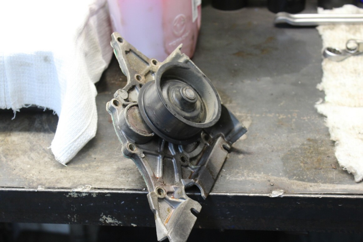 Проблема: уходит антифриз. Откуда — непонятно. Сверху всё сухо, а внизу с защиты подтекает. Сняли защиту, антифриз капает в районе шкива коленвала. Подозрение на помпу. Но, чтобы убедиться, вооружаемся эндоскопом. Действительно, течёт помпа. Обсуждаем с владельцем замену, так как помпа находится в приводе ГРМ, разумно будет заменить сразу и комплект ремня.