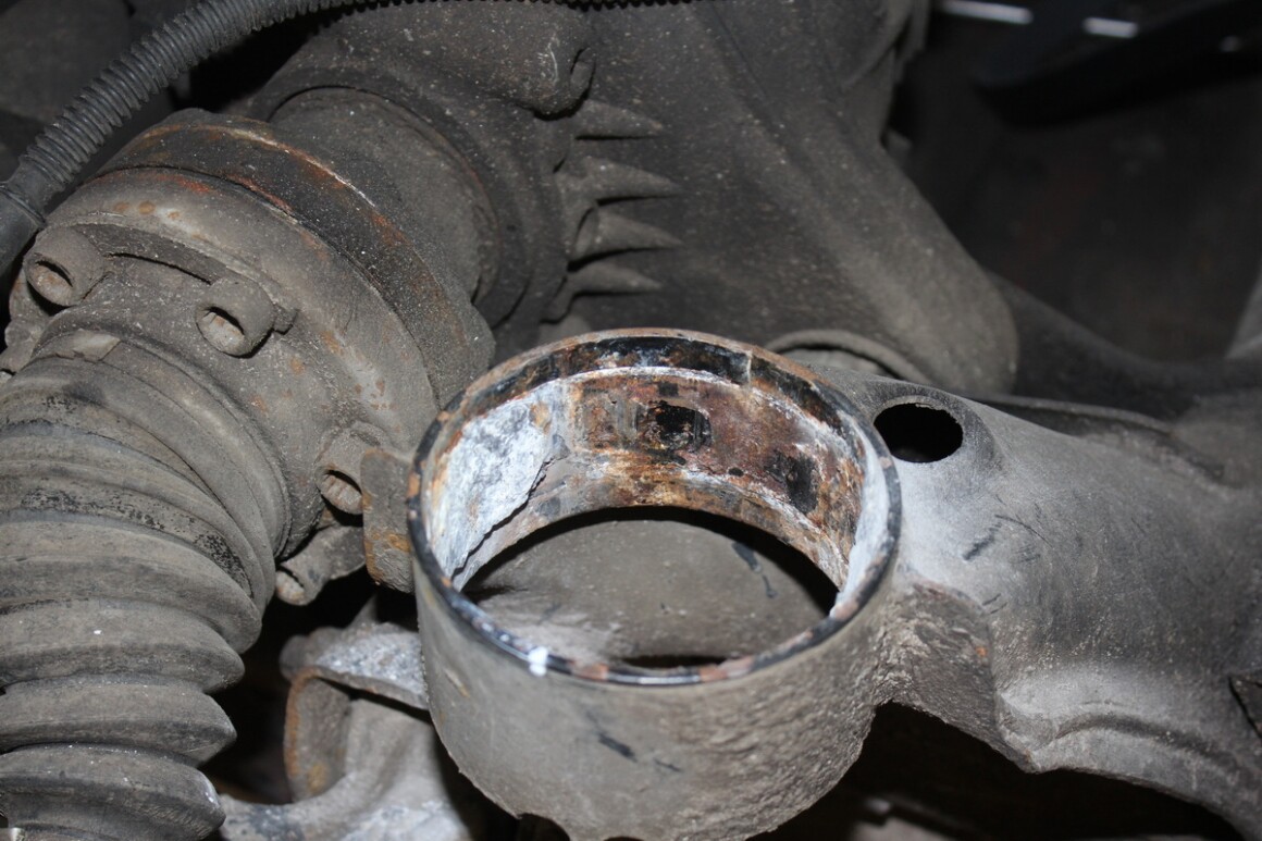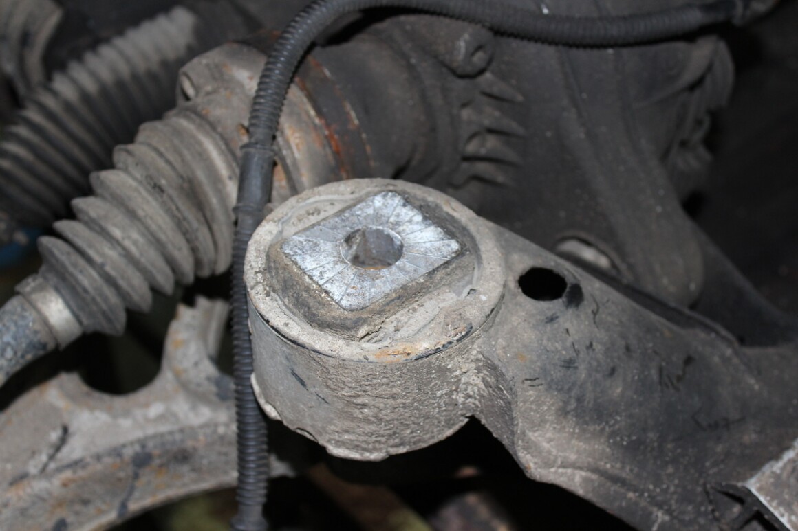 При предыдущем ремонте мы порекомендовали владельцу заменить данные сайлентблоки в связи с износом и трещинами. Теперь приступаем к ремонту. Для их замены необходимо опускать подрамник.