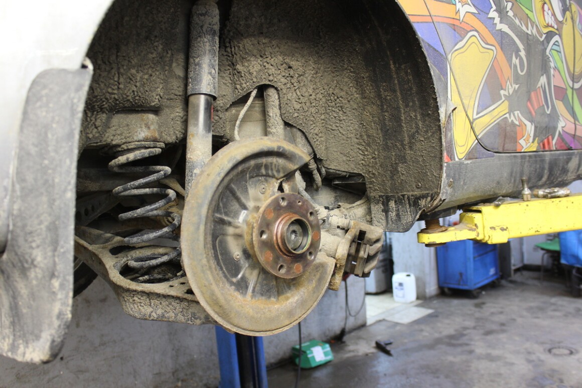 Поднимаем, проверяем, слушаем. Гудят подшипники задних ступиц. Будем ремонтировать. Разбираем.