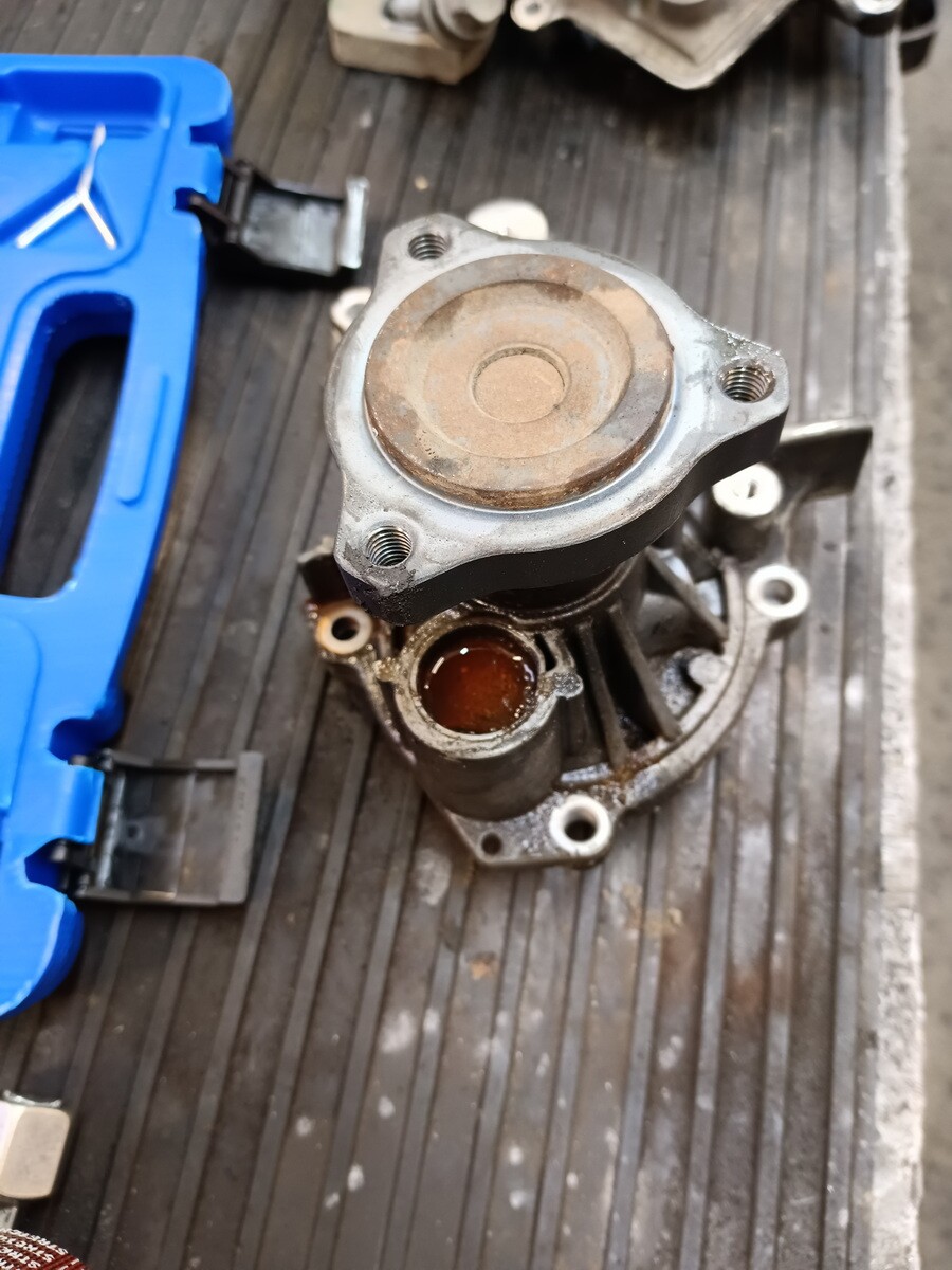 Сообщаем хозяину, он даёт распоряжение ремонтировать. Приступаем. Помпа находится за приводом ГРМ, поэтому снимаем ремень ГРМ и после этого помпу. Одновременно заказываем комплект ремня ГРМ, насос ОЖ.