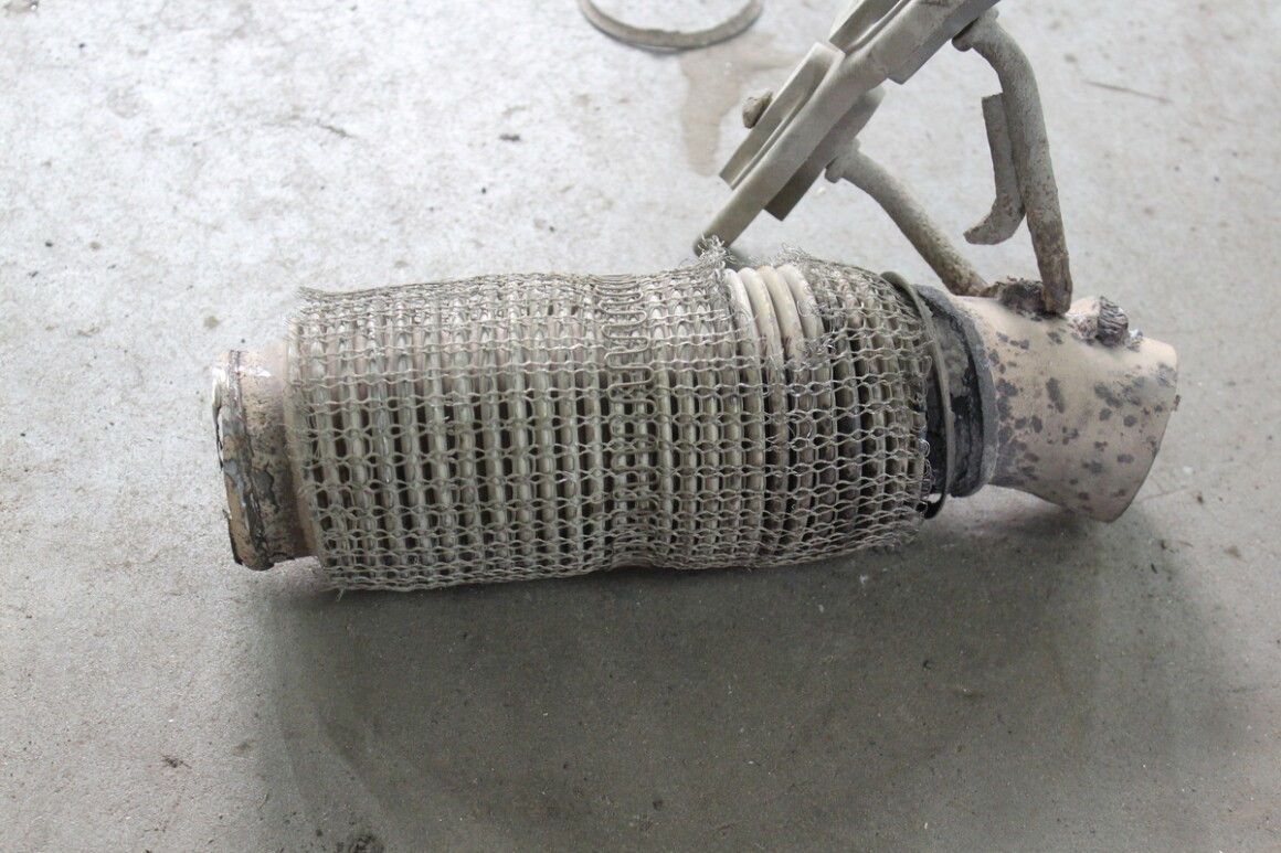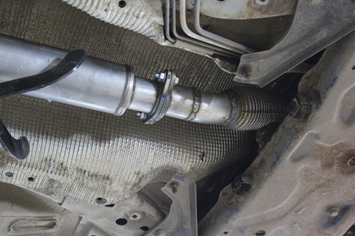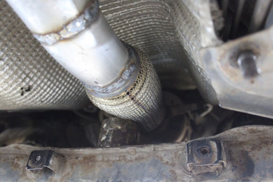 Запускаем, поднимаем, осматриваем. Видим прохудившуюся гофру, подгнивший резонатор. Владелец одобрил замену, приступаем.