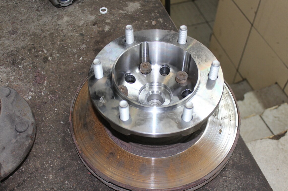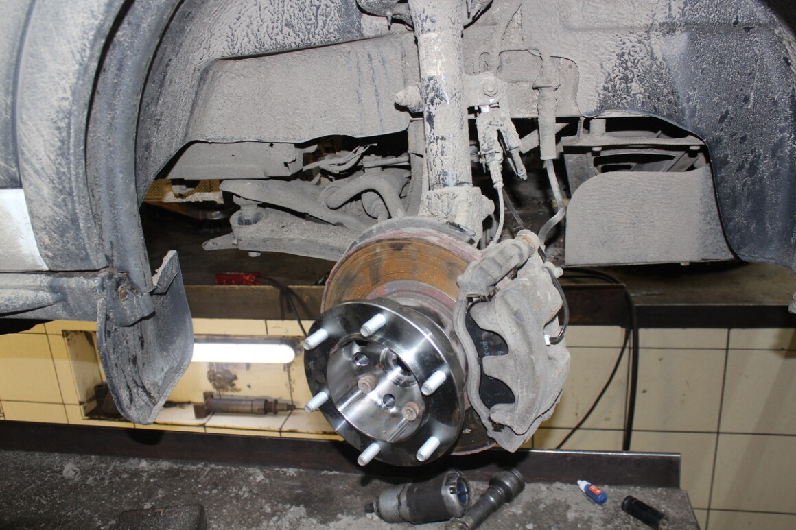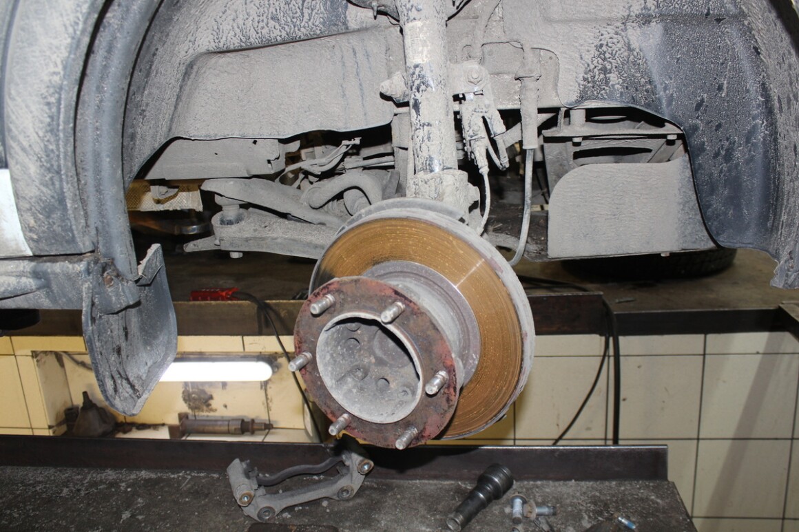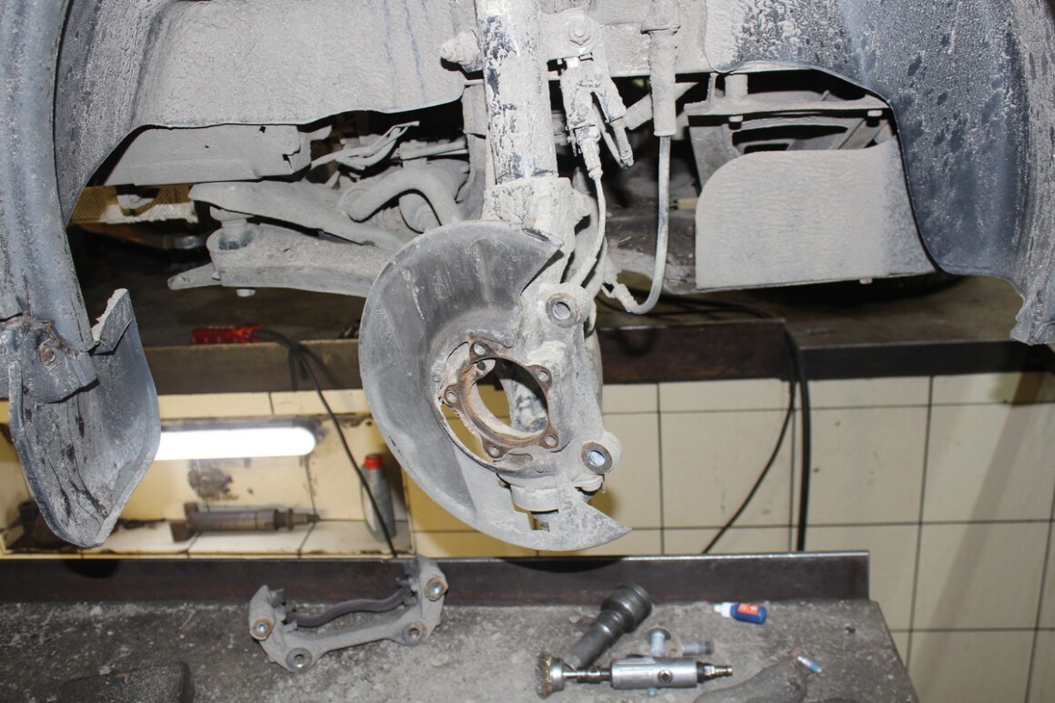 Подшипник в данной конструкции идет в сборе со ступицей. Переустанавливаем тормозной диск на новую ступицу и монтируем детали на место. Пока всё разобрано, заодно меняем тормозные колодки, так как остаточная толщина около 30%