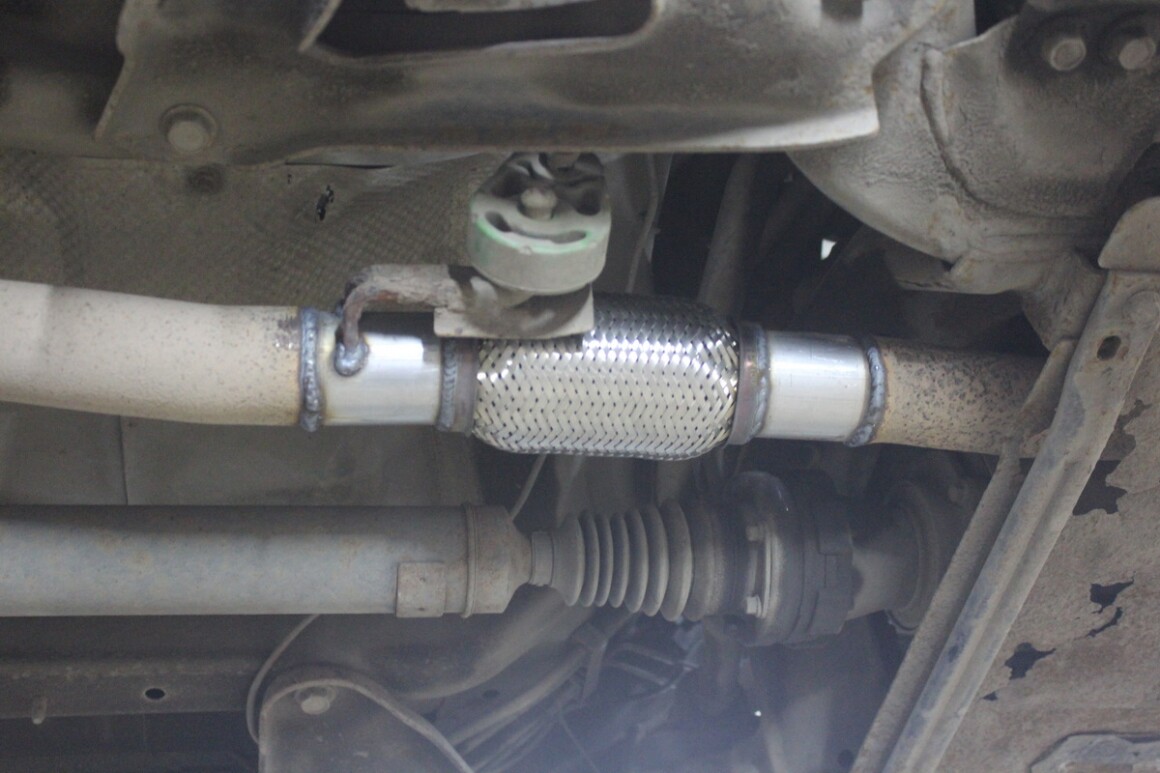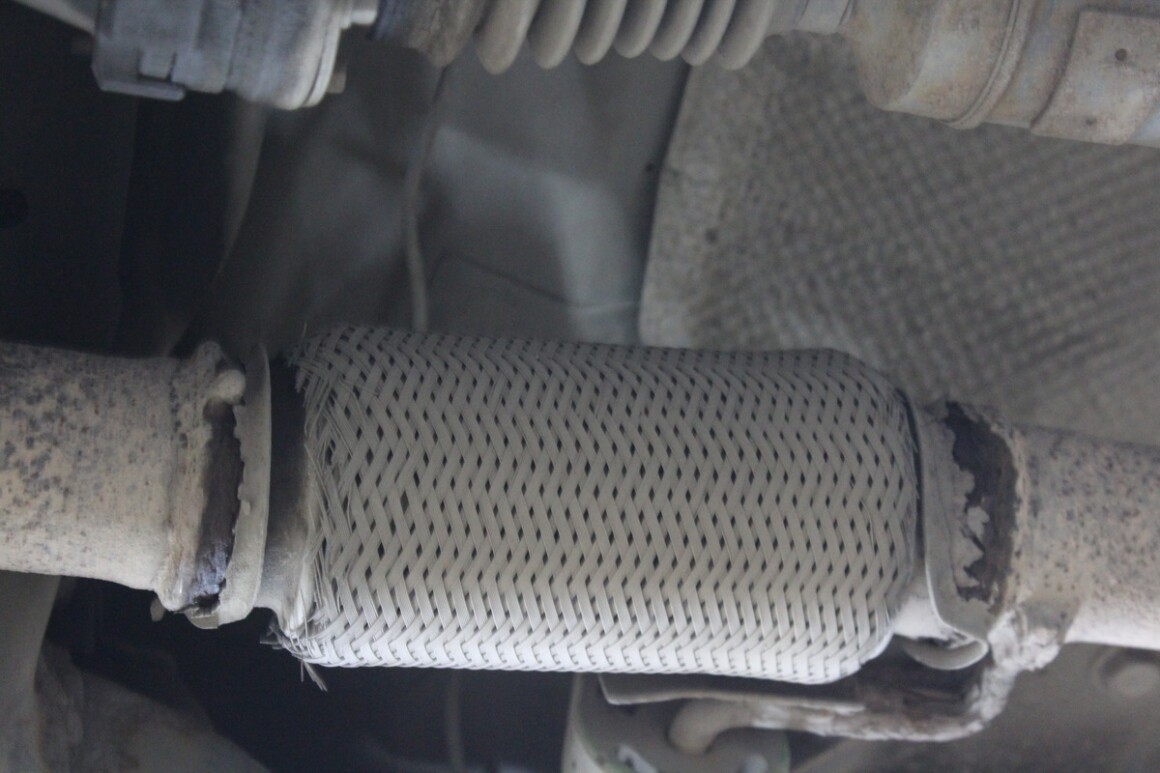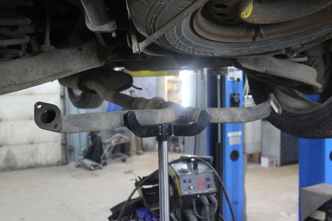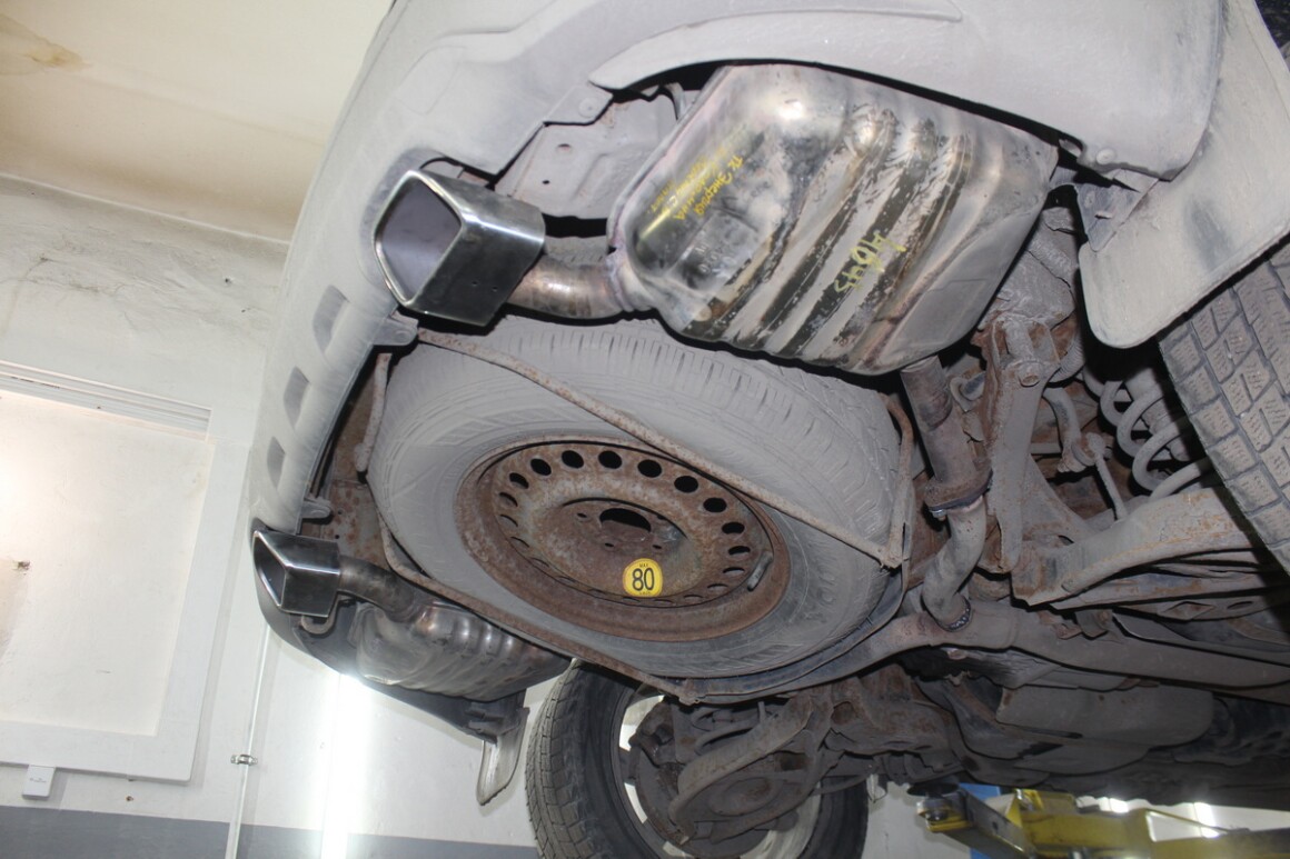Подняли машину, осмотрели. Оказалось, что правый глушитель отгорел и отвалился где-то по дороге, левый вот-вот отвалится, также прогорела гофра выхлопной трубы. Обсуждаем с хозяйкой возможные варианты ремонта. Оказывается, она уже заезжала в другое место на осмотр и ей назвали космическую сумму ремонта с учетом покупки правого нового глушителя: 150000р!