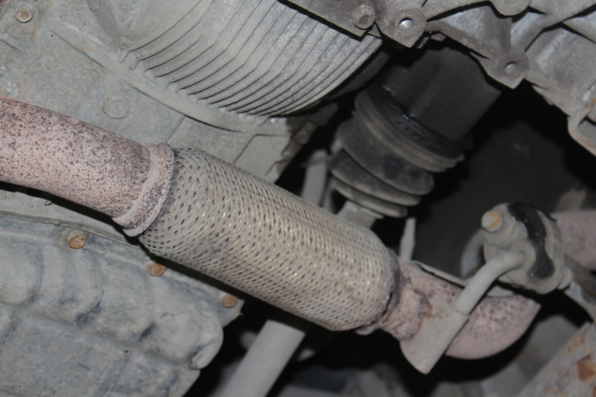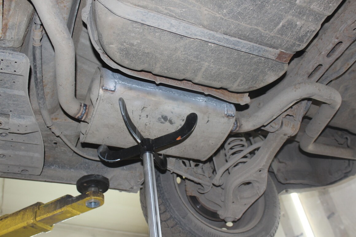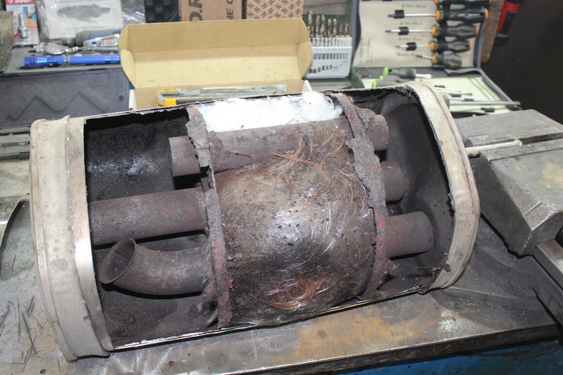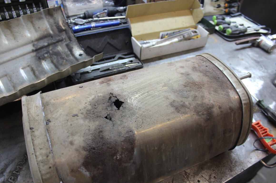 Запускаем для проверки, стало лучше, но всё же посторонний звук остался. Хозяин настроен решительно, просит нас разобраться в дефектах выхлопной системы. Звук исходит от основного глушителя, хотя внешне дефектов нет.