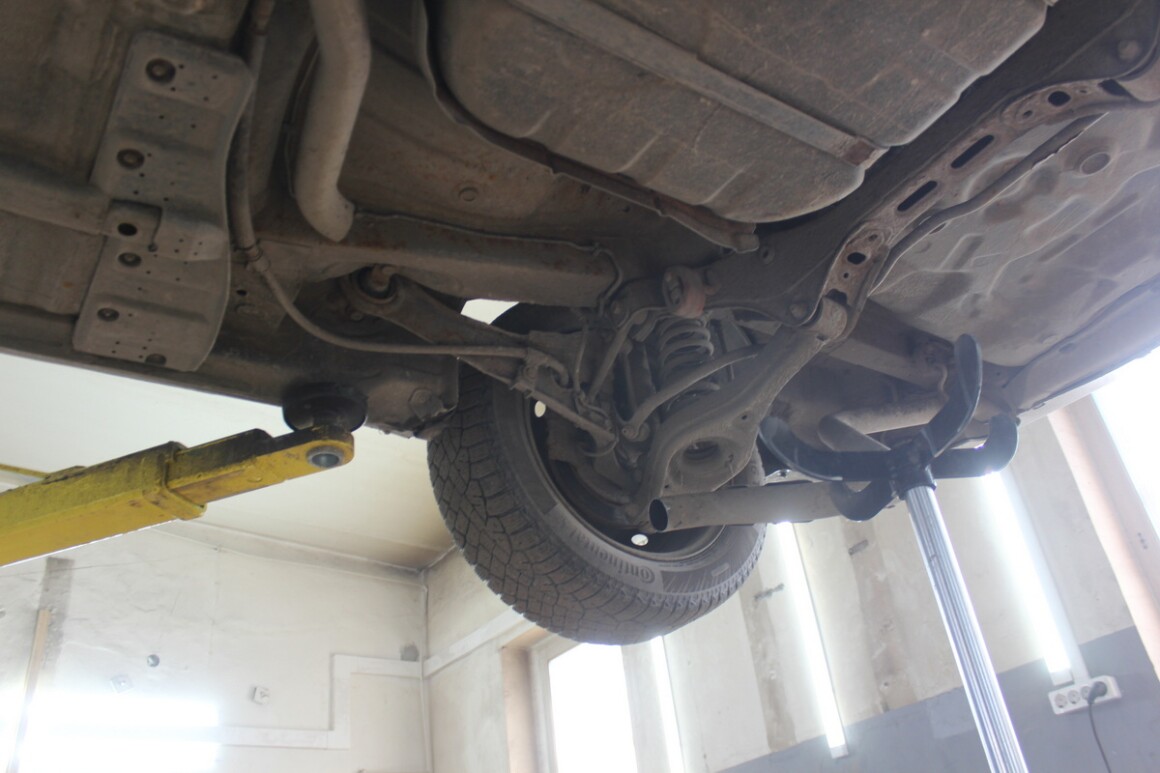 Поднимаем на подъёмник, осматриваем, видим худую гофру.