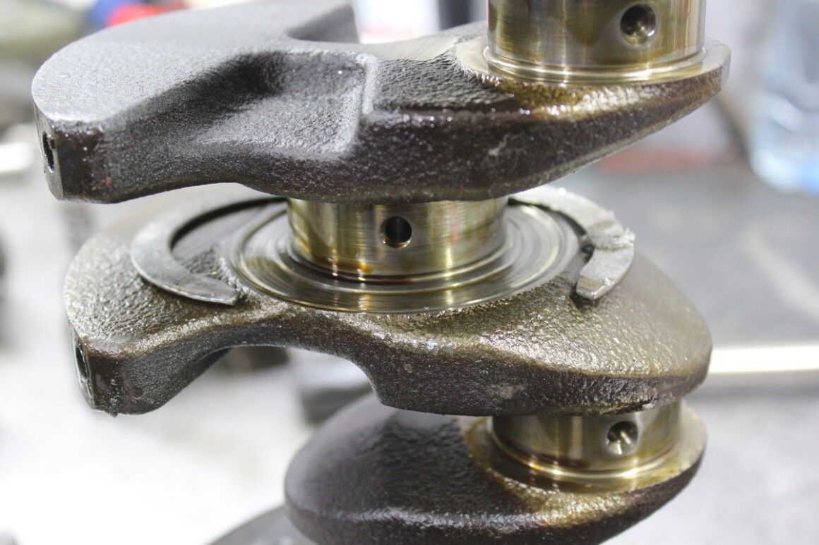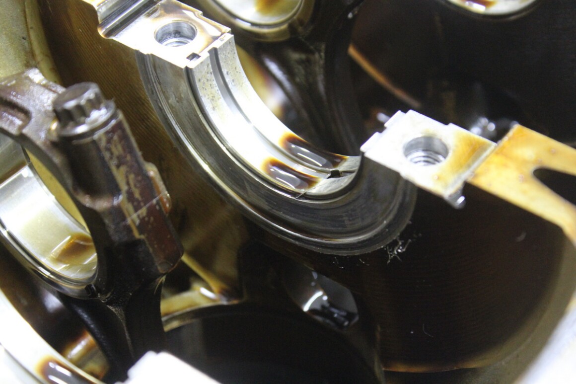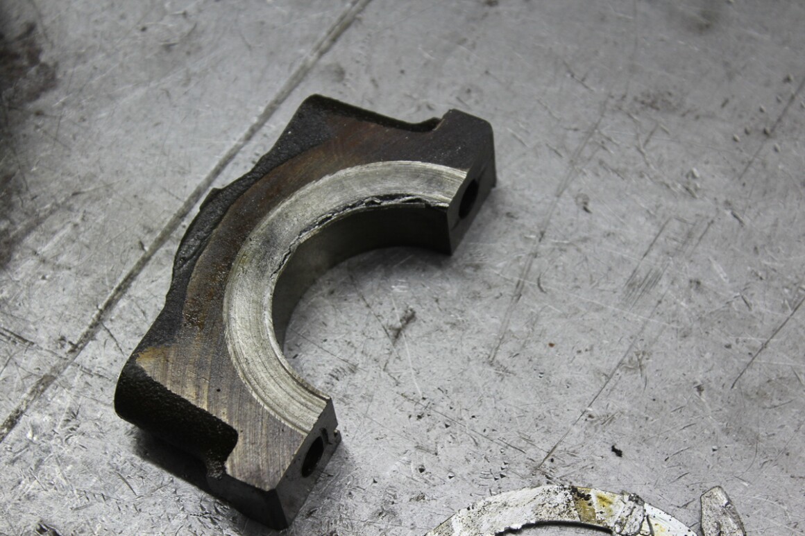 Видим причину заклинивания коленвала: упорное полукольцо сточило торцевую поверхность коленвала, появился излишний зазор, коленвал начал перемещаться в осевом направлении уже утончившееся полукольцо частично провернулось вместе с коленвалом, что вызвало заклинивание двигателя.