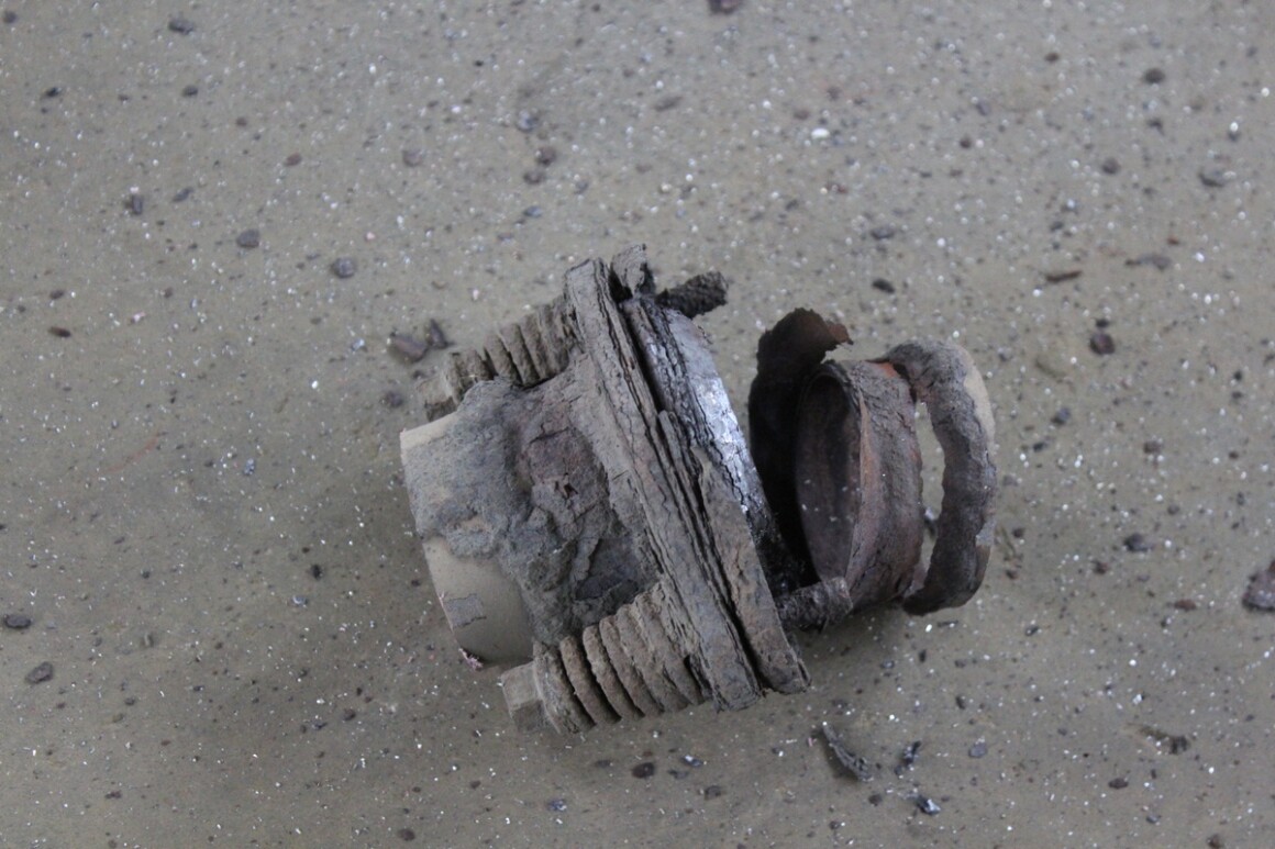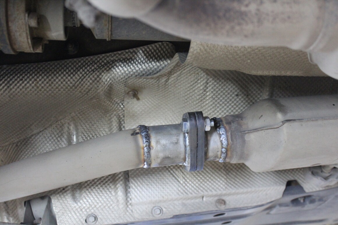 Поднимаем, смотрим, видим отгнивший фланец между приёмной трубой и резонатором. Будем менять на ремонтный. Стоял, кстати, уже ремонтный. Но почему-то демпферного типа, хотя должен быть обычный плоский.