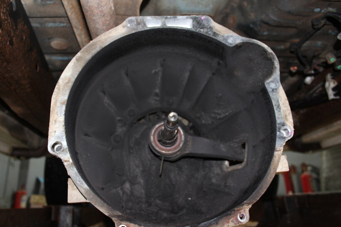 Рядом с машиной ощущается стойкий запах гари, предполагаем сгоревшее сцепление. Оно и понятно, машина трудится в фермерском хозяйстве, используется по назначению. Заказываем детали и приступаем к разборке. Нужно снимать КПП в сборе с раздаткой. Работа непростая, но спустя три часа КПП снята.
