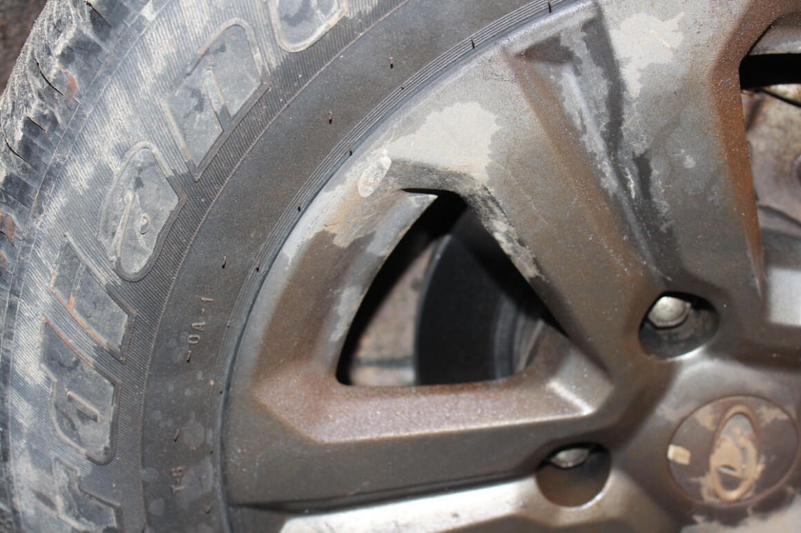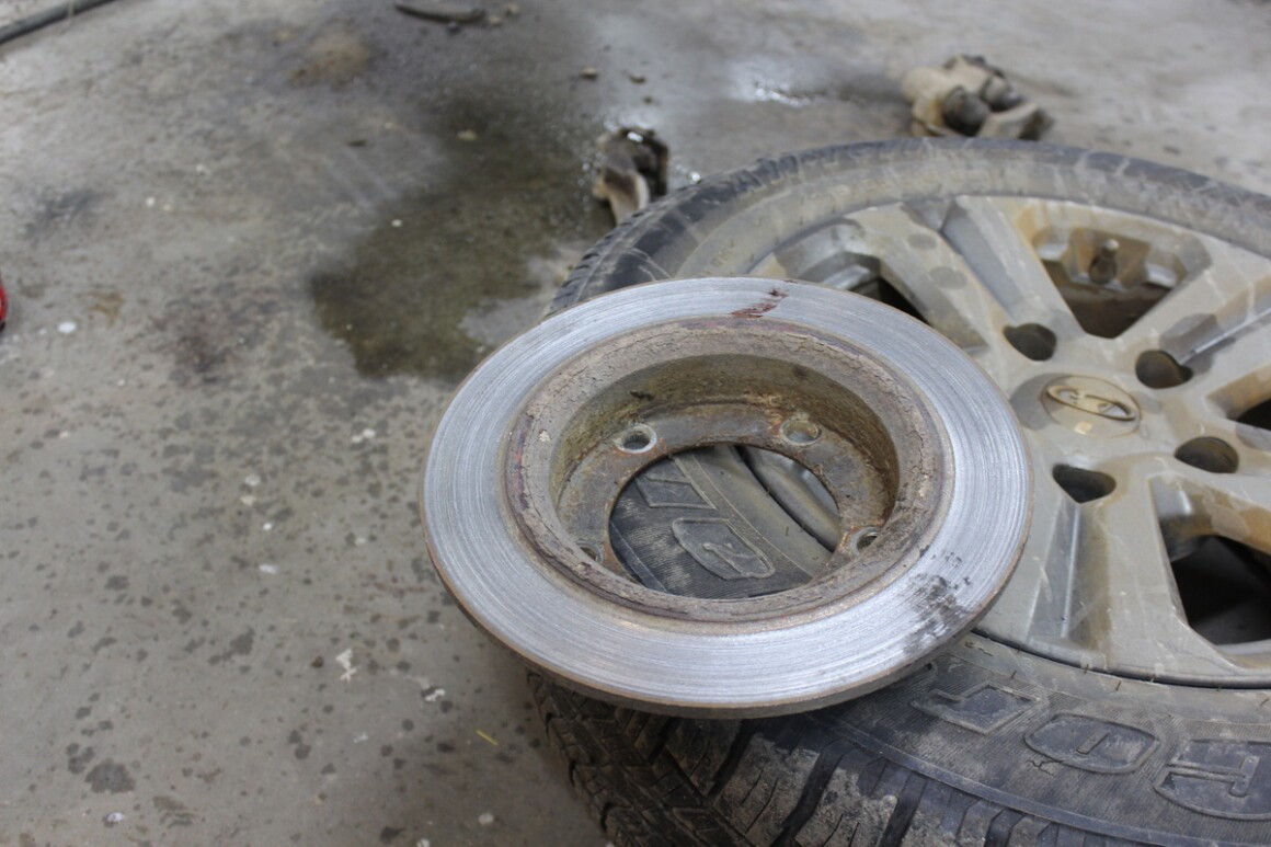Взволнованный владелец жалуется на скрежет спереди при торможении. При осмотре обращаем внимание на колёсный диск, покрытый ржавым налётом, обычно это от предельного износа колодок, когда торможение идёт уже металл по металлу.