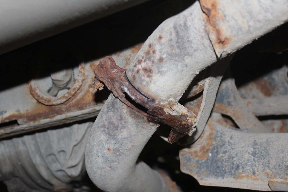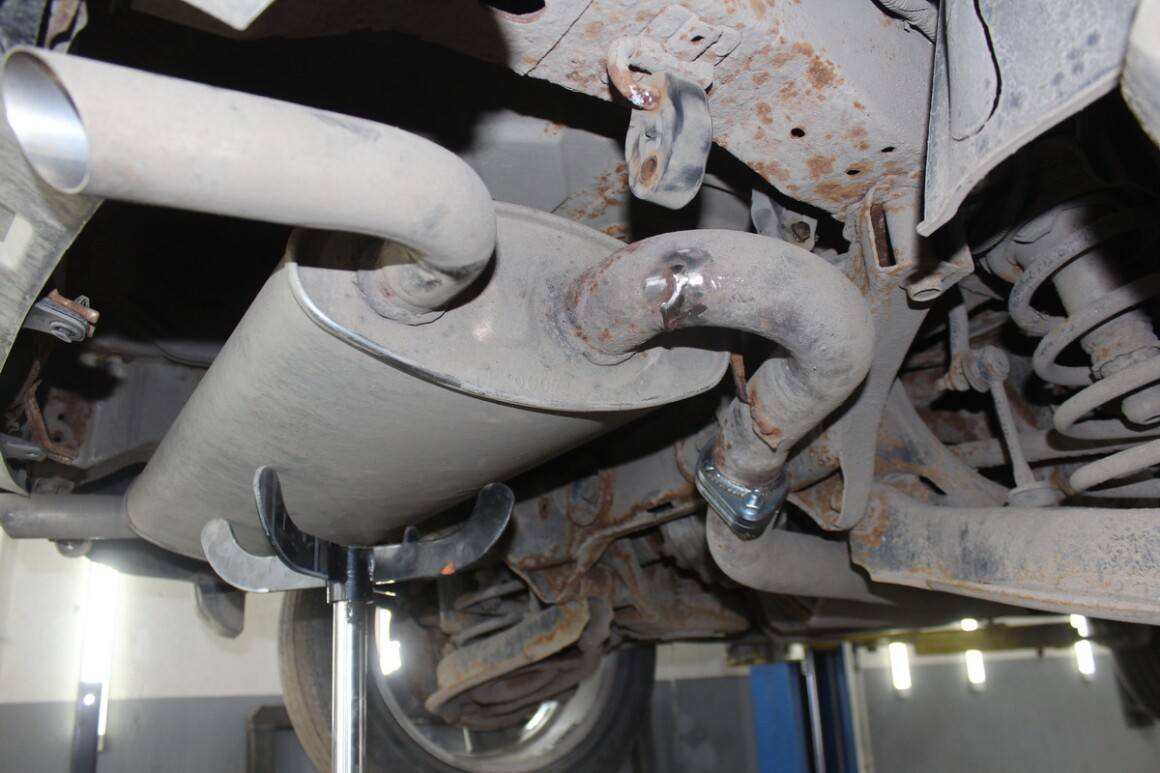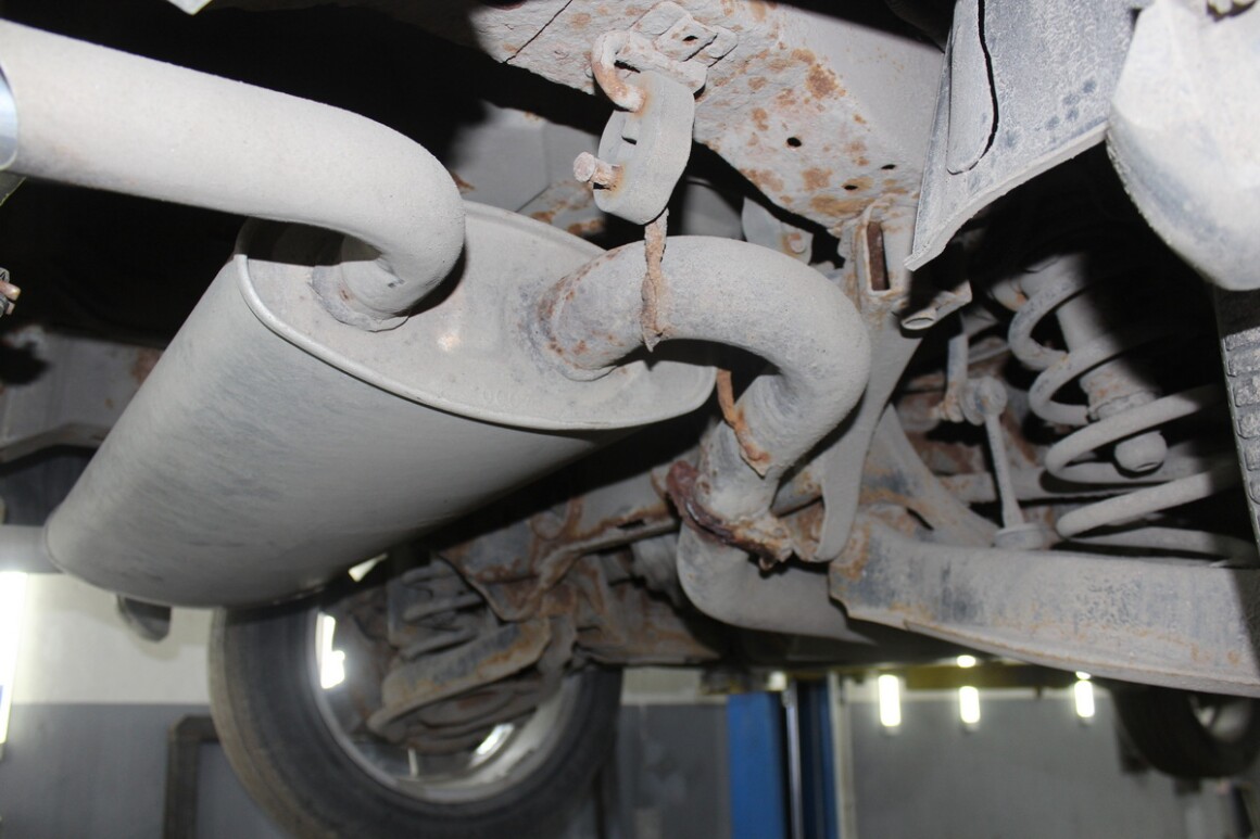 Поднимаем, осматриваем, обсуждаем. Нужно менять фланец глушителя и восстанавливать крепление подвеса глушителя. Хозяин согласен, поэтому сразу приступаем.