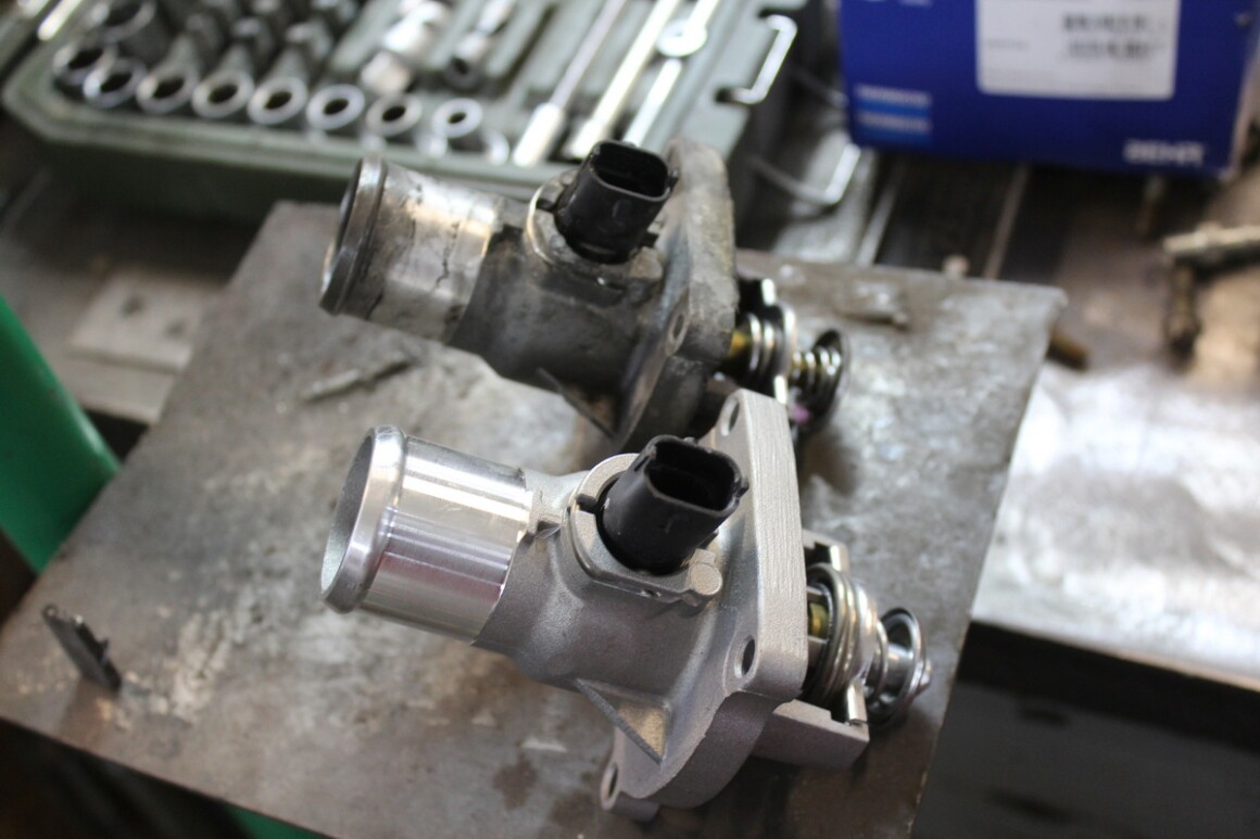 Заказали, получили, установили новый корпус термостата. Устанавливаем новый термостат. Если выбор запчастей доверяют нам, устанавливаем MAHLE.