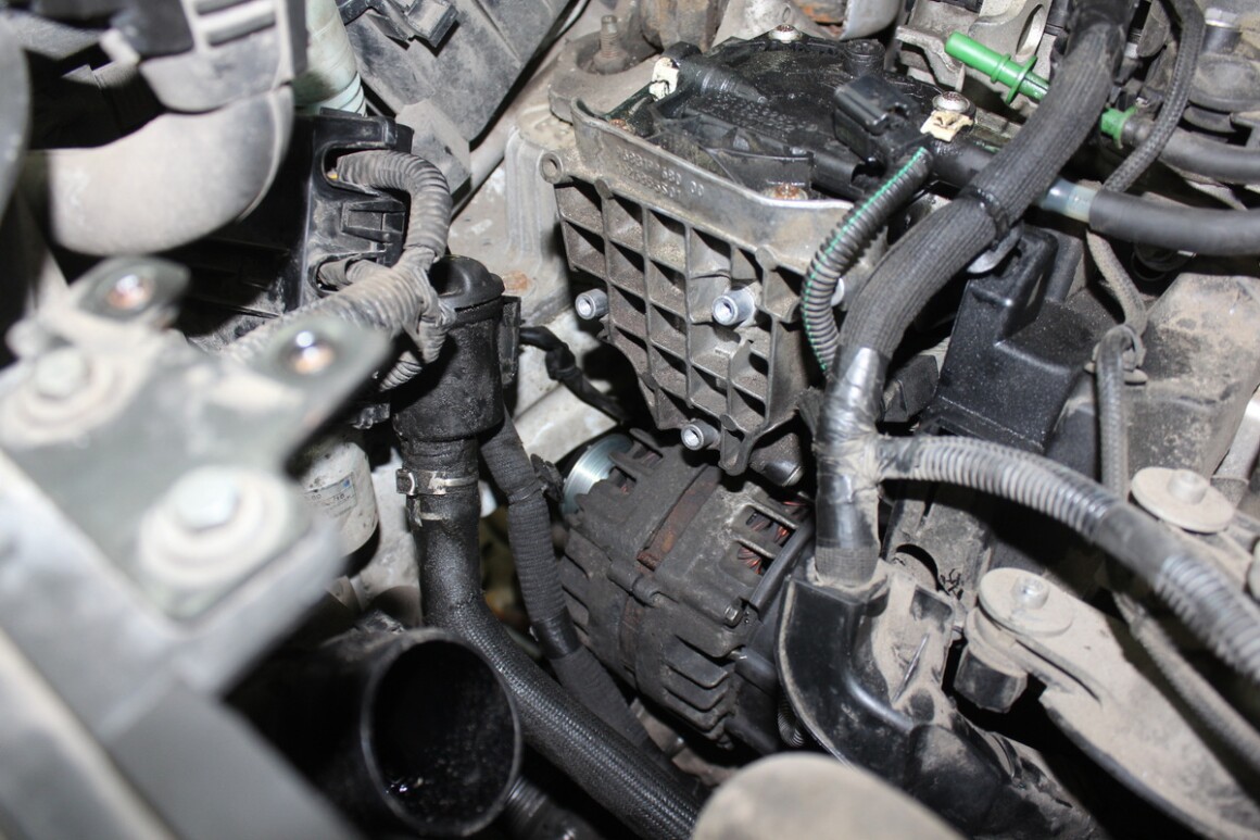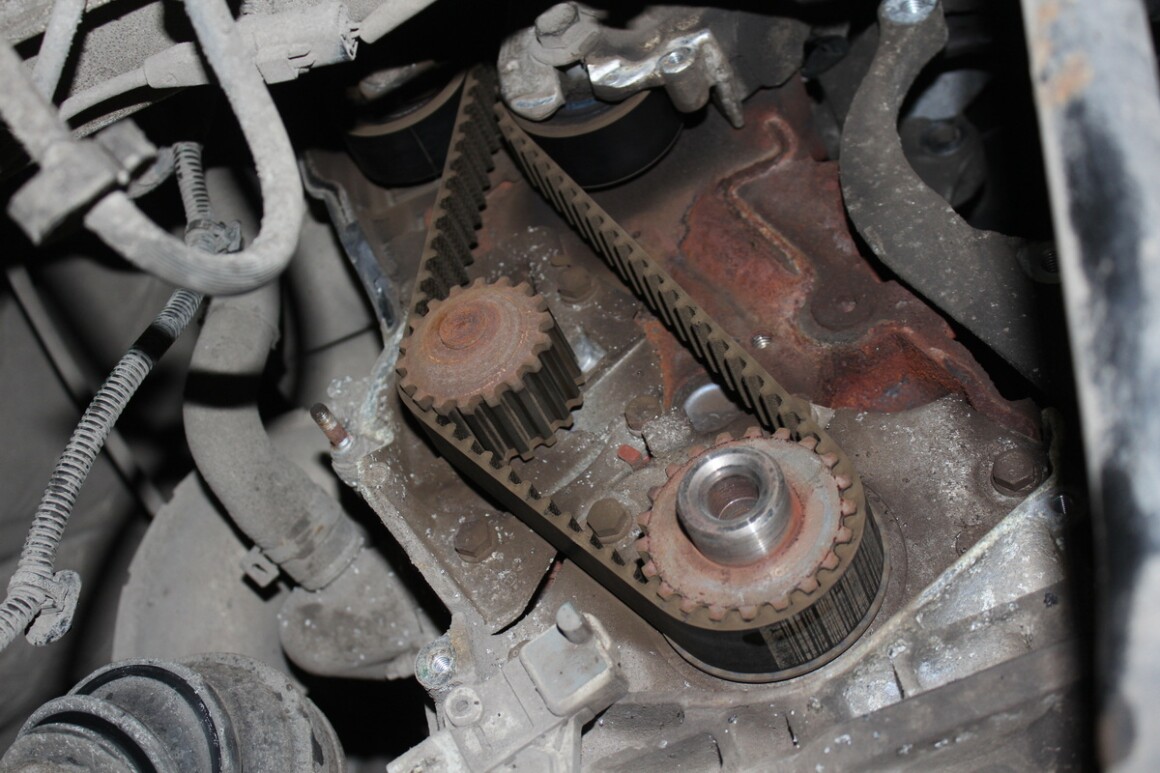 Послушали, в первую очередь идёт шум от генератора. На этих автомобилях все агрегаты расположены очень неудобно, поэтому предлагаем попутно разбирать дальше переднюю часть мотора для замены привода ГРМ, учитывая то, что пробег уже 150 тысяч, а ремень ещё не менялся. Также обговорили, что будет замена внешнего ремня, натяжителя, насоса ОЖ и антифриза.
