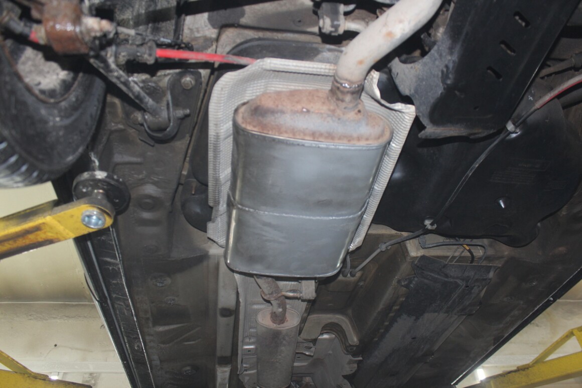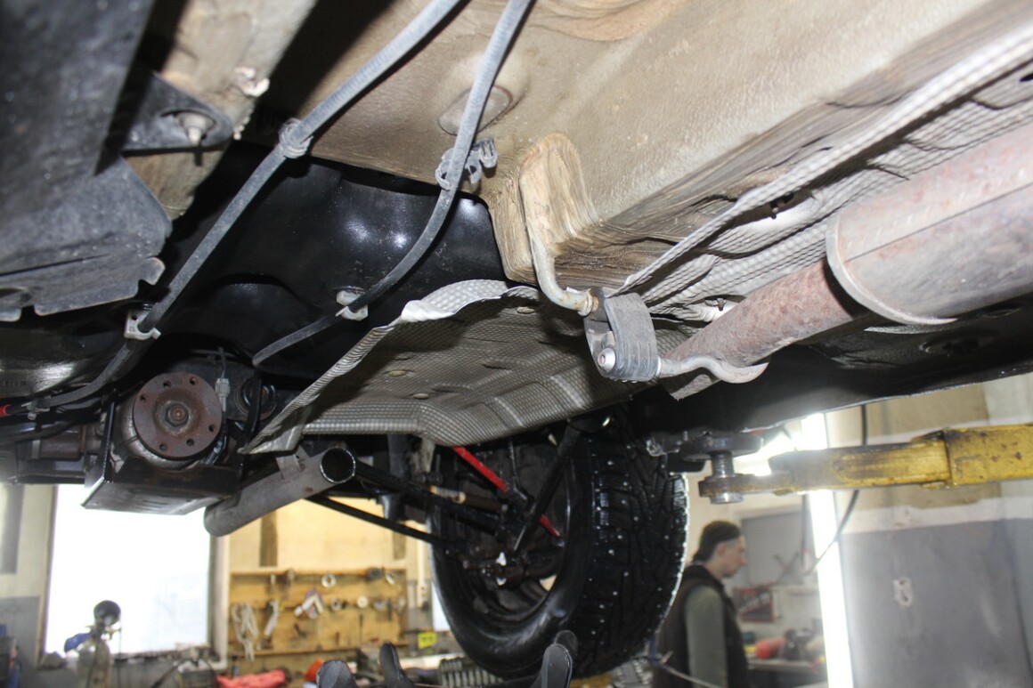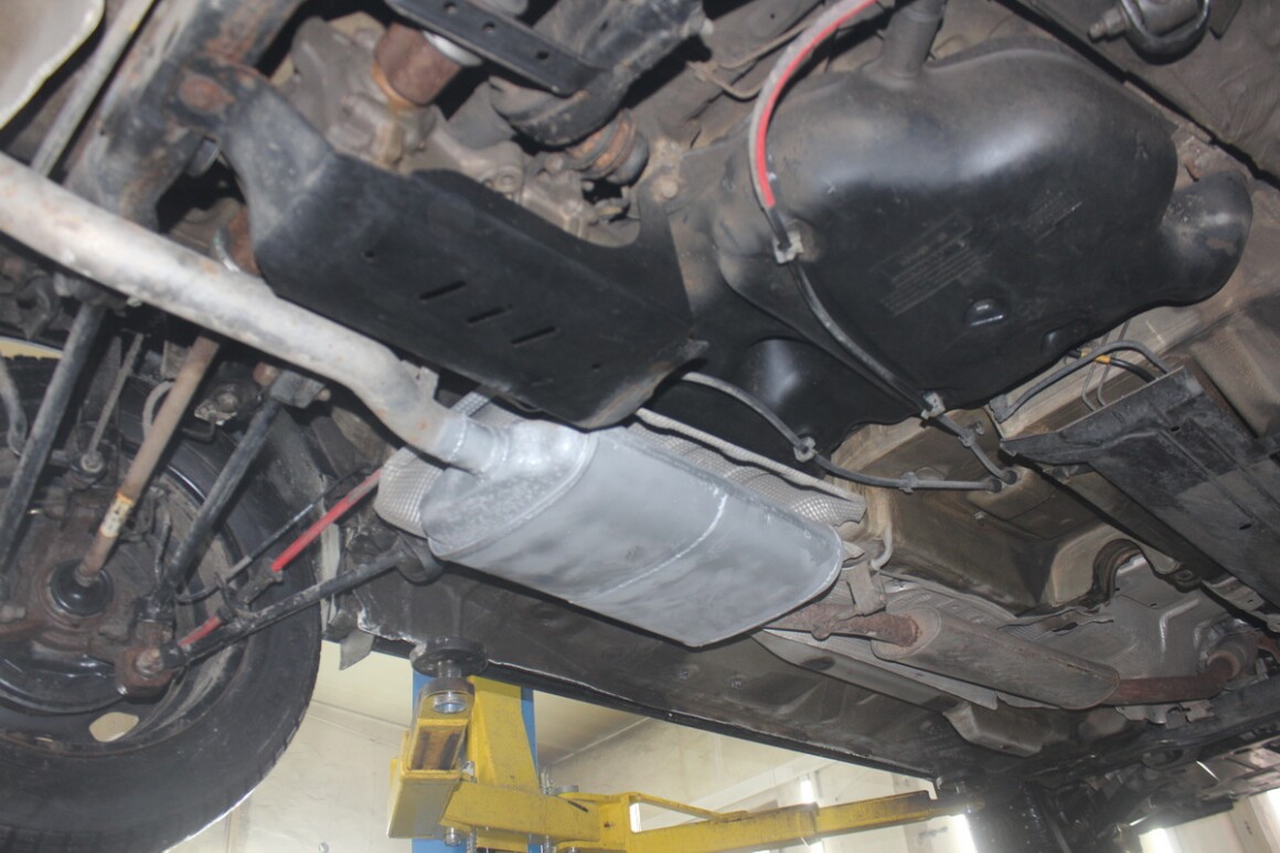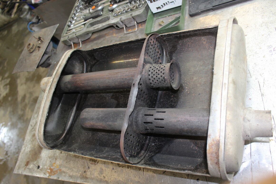 Где-то в колее машина зацепилась глушителем за препятствие, глушитель загнуло, он прохудился и стал гудеть. Хозяин хотел приобрести новый, но это оказалось проблемой, новый глушитель купить невозможно. Тогда он позвонил нам посоветоваться, мы пригласили его на осмотр. Машина на подъёмнике, срезали глушитель, вскрыли его, сможем сделать.