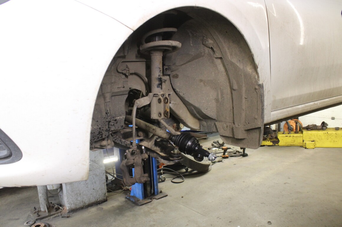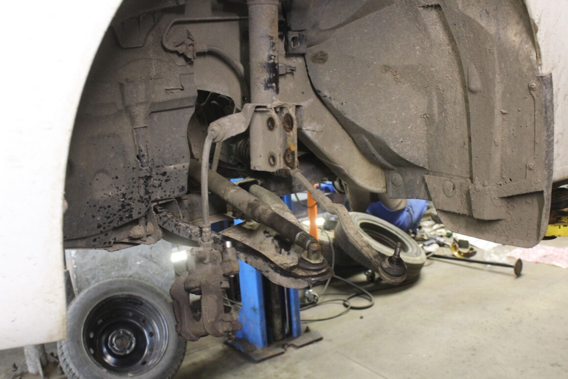 Хорошо, отремонтируем. Поднимаем авто, диагностируем, составляем список. Под замену: передние ступичные подшипники, левый внешний ШРУС, тормозные диски и колодки.