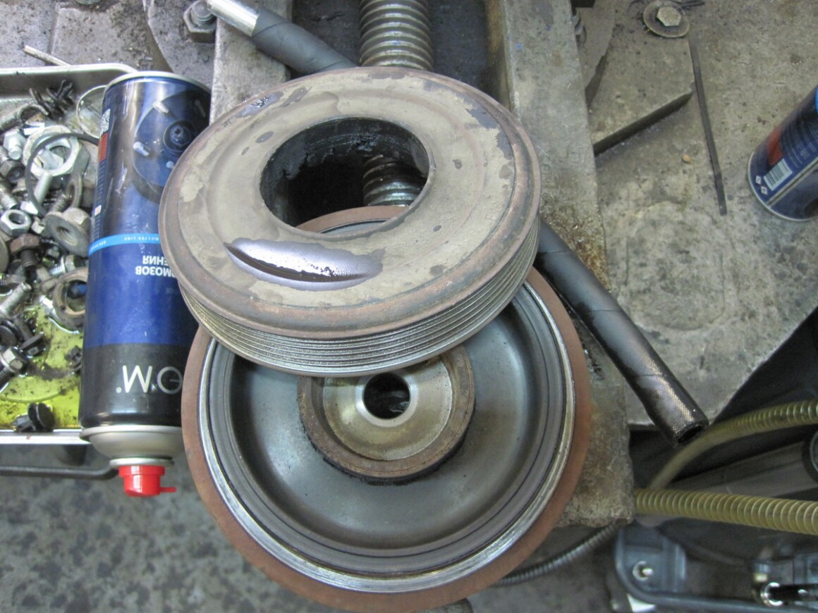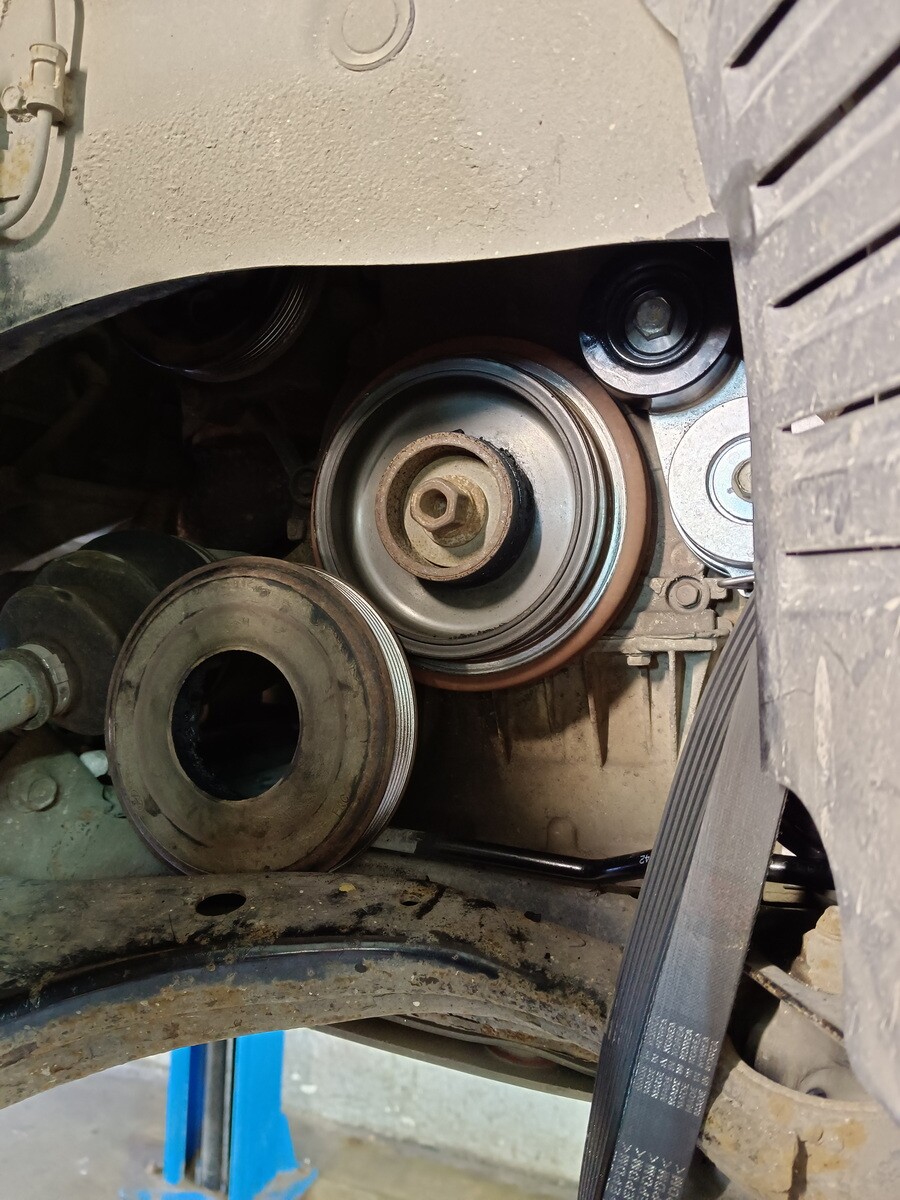 Жалоба на шелест при работе двигателя, запах жженой резины и пропадание усиления ГУР. Послушали, посмотрели, пришли к предварительному выводу о пробуксовке ремня. Будем разбираться. Загнали автомобиль на подъёмник, сняли защиту, кожух. Сняли ремень и увидели раздвоившийся шкив коленвала, он же демпфер. Внутренняя его часть продолжала вращаться вместе с коленвалом, а внешняя часть, которая приводит в движение ремень, начала пробуксовывать из-за отслоившейся резиновой прослойки. Отсюда и шелест, и запах, и пробуксовка.
