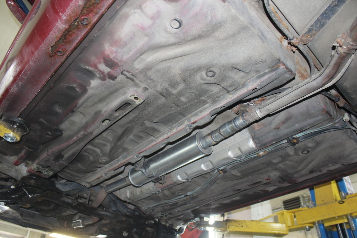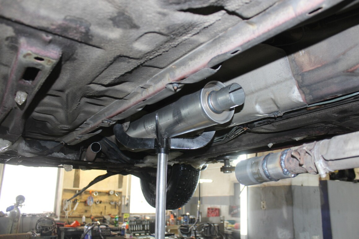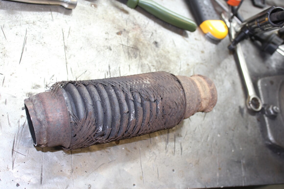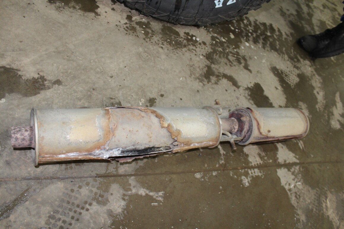 Поднимаем на подъёмнике, осматриваем, развалилась гофра. Владелец согласен, меняем.