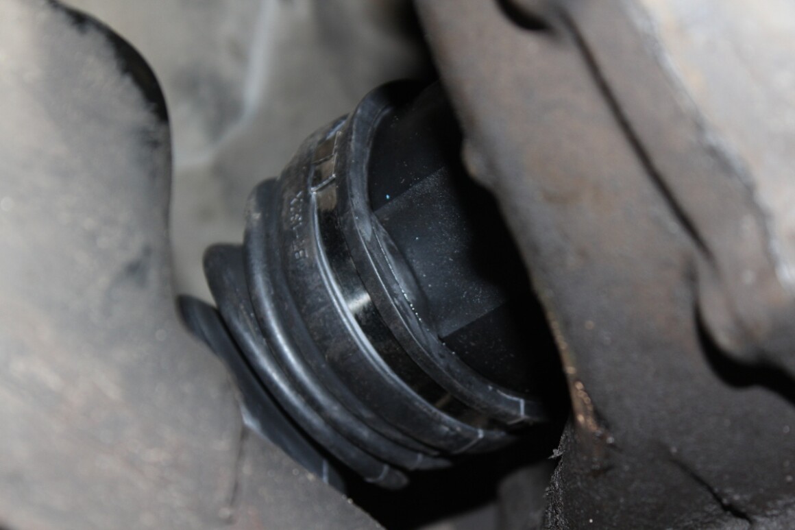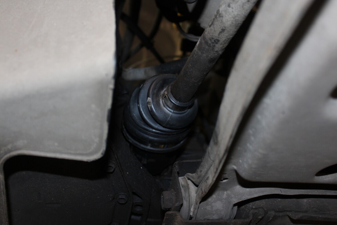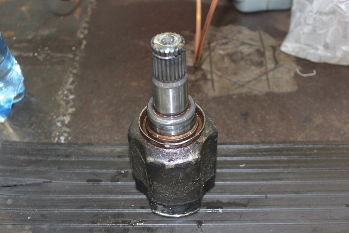 Поднимаем автомобиль, проводим диагностику. Из дефектов — порванный чехол левого внутреннего ШРУСа и повышенный люфт в нём. Будем менять. Заказываем деталь. Так как доставка быстрая, сразу разбираем. Снимаем левый привод и демонтируем внутренний ШРУС.