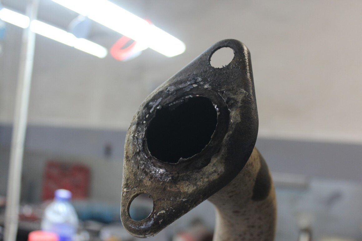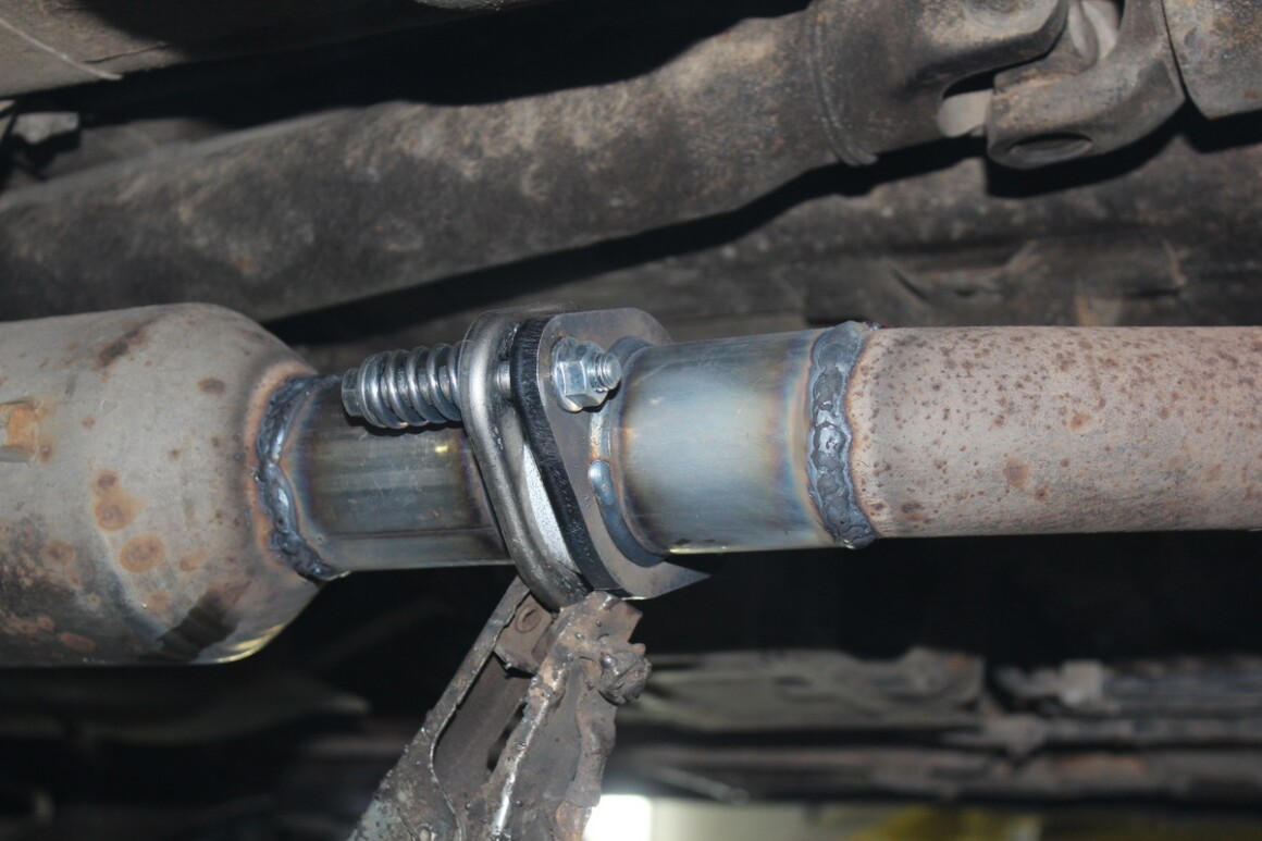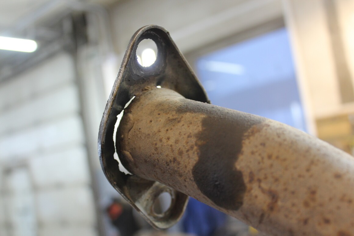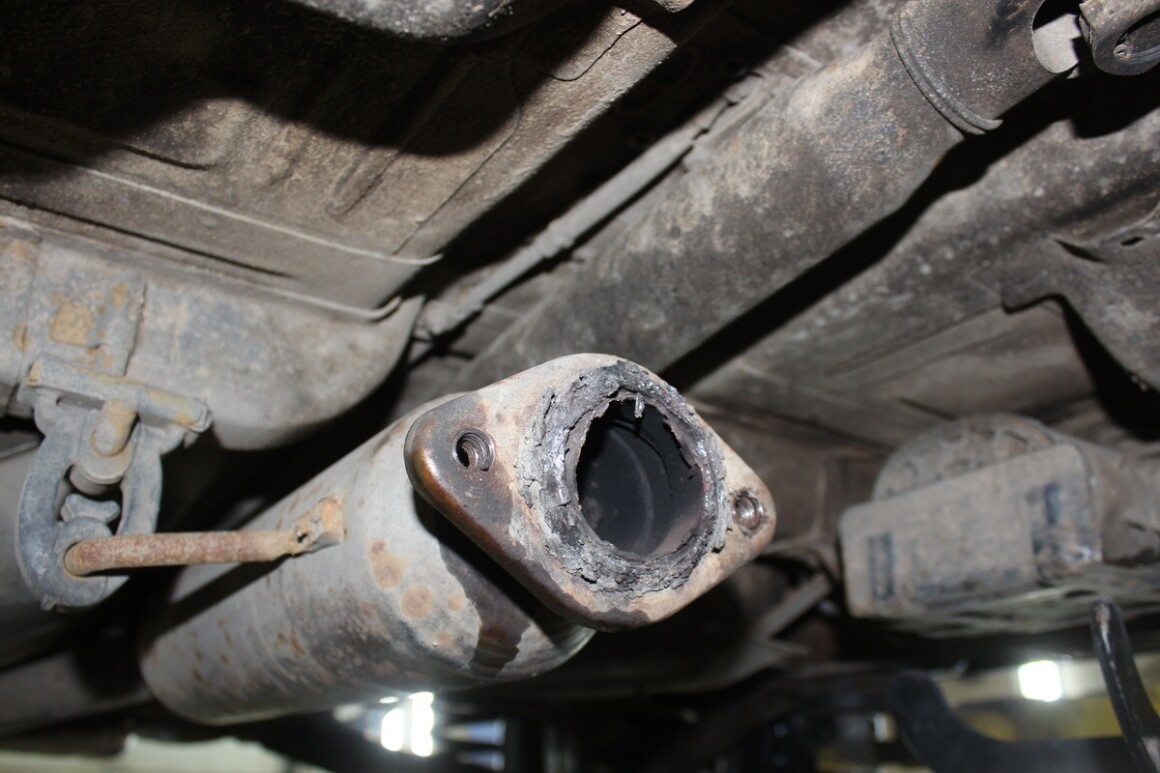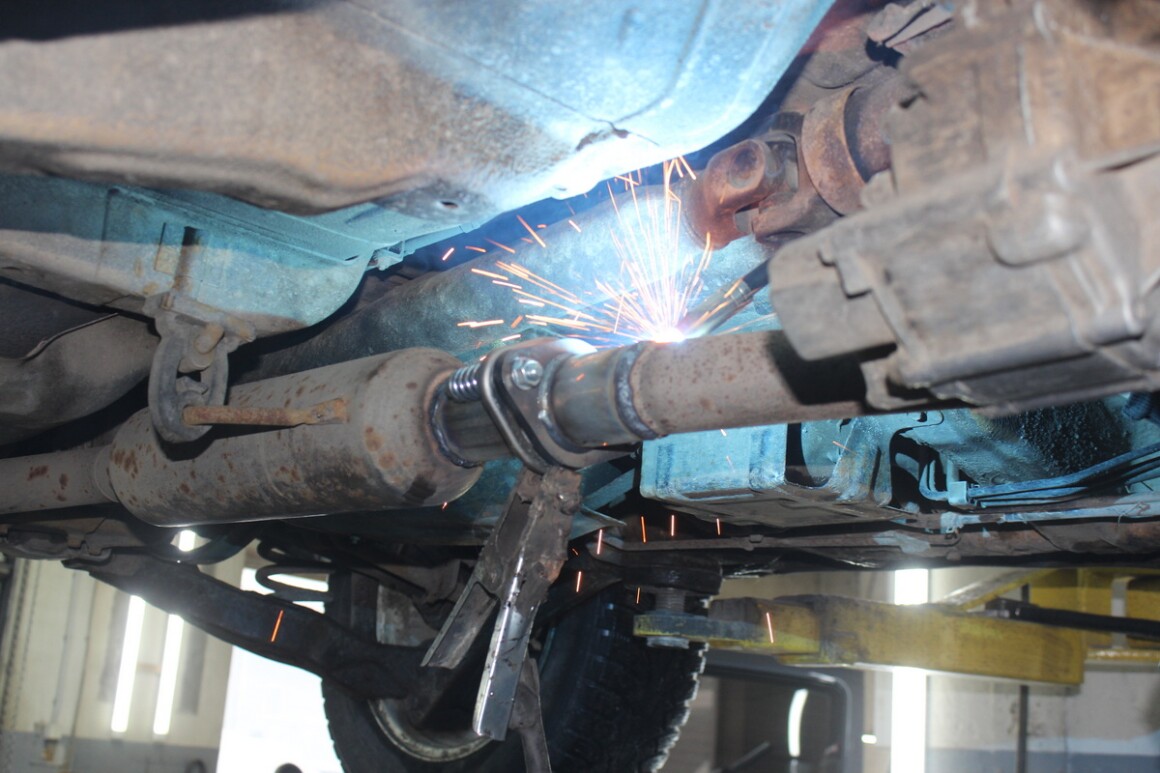 Поднимаем машину с запущенным мотором, осматриваем, видим неплотное соединение приёмной трубы и резонатора. Там стоит сферическое медно-графитовое кольцо, сейчас заменим.