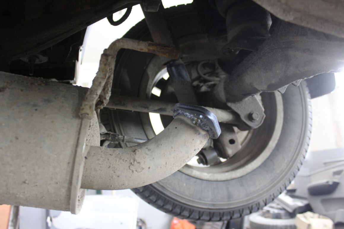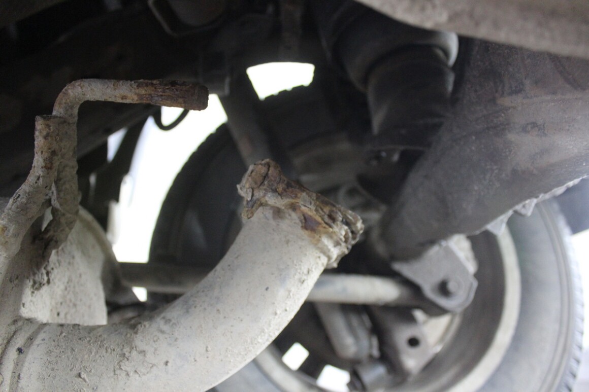 Подняли, видим отгнивший фланец между глушителем и выпускной трубой.