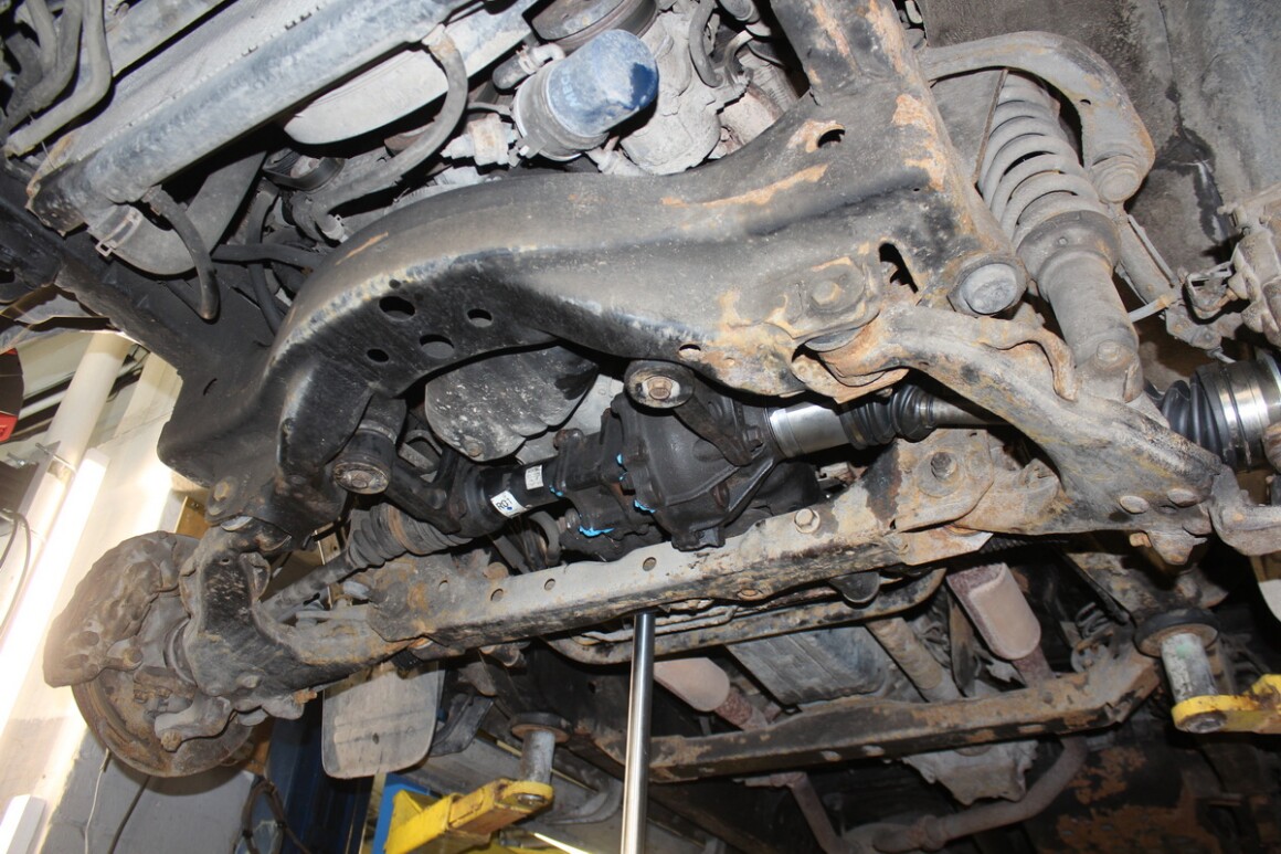 Проблема в отсутствии полного привода. Включение с кнопки происходит, но передок не работает и спереди из редуктора идёт хруст. Проверяем машину с вывешенными колёсами, хруст идёт из переднего редуктора. Откручиваем сливную пробку, там стальная стружка и куски шестерён.
