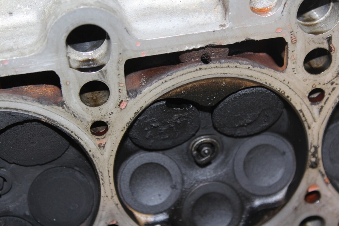 Сняли ГБЦ. Видим прогар клапана. Также видно, что это не первая проблема с данным мотором, на поршне есть вмятины от оторванной тарелки клапана.